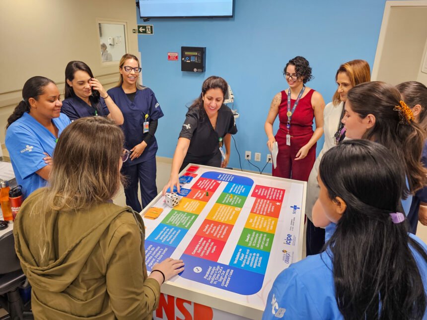 Em março, um desses momentos educativos adotou uma abordagem lúdica para engajar a equipe. Ao longo de uma semana, um carrinho percorreu diferentes alas do hospital, levando peões, dados e a oportunidade de relembrar conhecimentos. Era o PitStop da Segurança do Paciente: uma parada obrigatória para reforçar normas do HCB relativas à higienização das mãos, identificação correta e medicação segura, entre outras. “Fizemos jogo de tabuleiro e campo minado; por meio deles, trouxemos perguntas para que o próprio funcionário consiga responder como se aplicam essas boas práticas. Conforme eles vão jogando e brincando, essas informações são reforçadas”, relata Moreira.