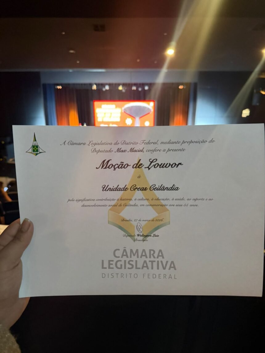 A horta comunitária do Centro de Referência Especializado de Assistência Social (Creas) de Ceilândia recebeu, na sexta-feira (27), uma moção de louvor pelos serviços prestados à cidade e sua população. A homenagem foi realizada durante sessão solene no Sesc Ceilândia, em comemoração aos 55 anos da cidade.